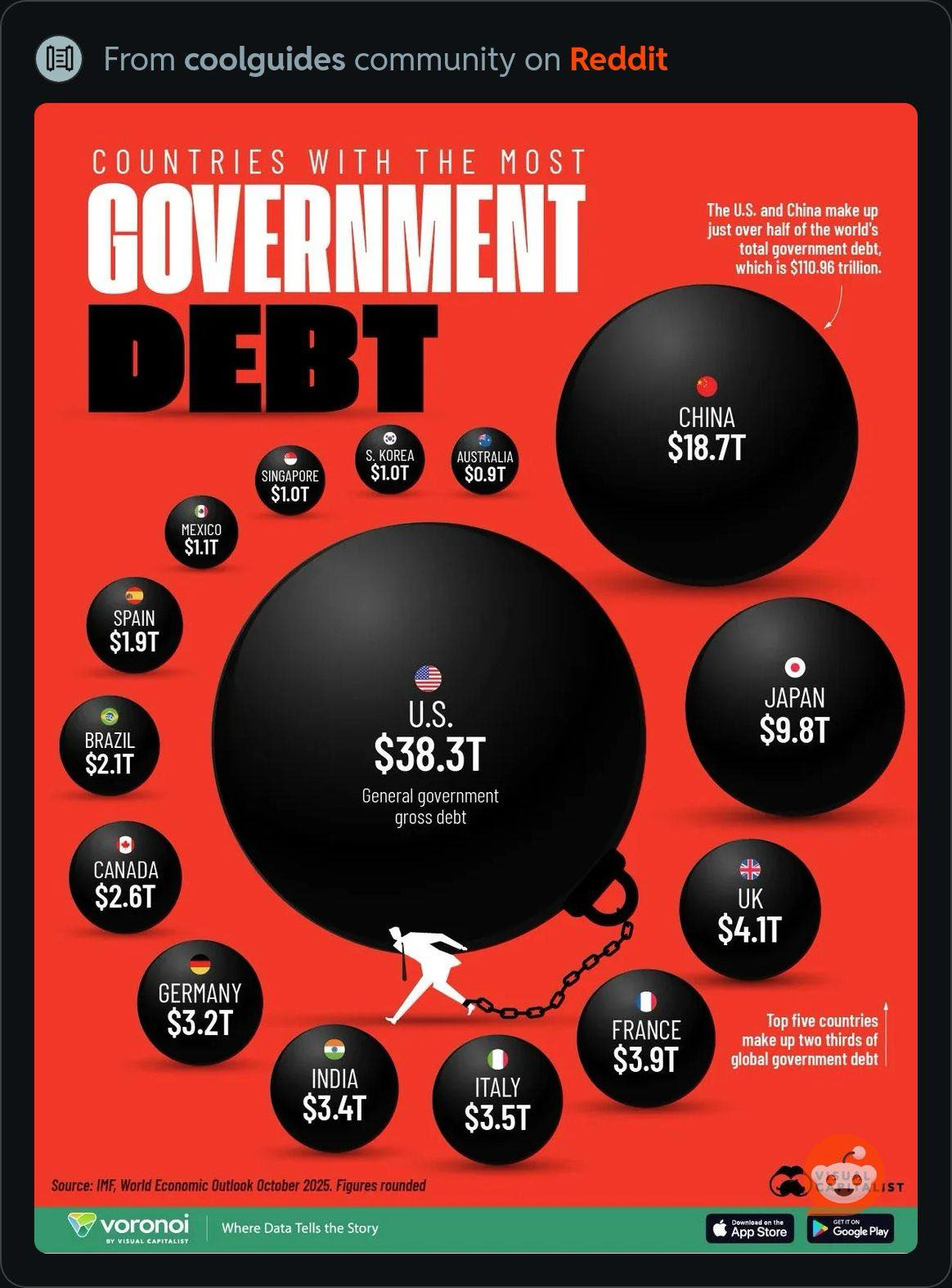 It’s basically government bonds. When the government spends more than it takes in through taxes, it borrows money by selling Treasury bonds (IOUs). People, companies, other countries, and even the U.S. government itself buy these bonds. The $38 trillion is the total of all those IOUs the government has promised to pay back.